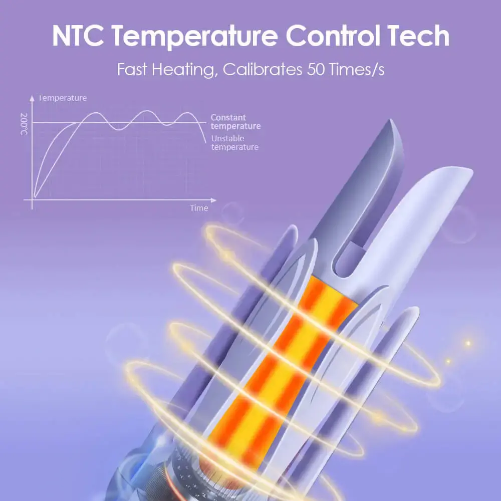 ✔️ Rapid Heating, 14s Styling: Unique NTC temperature control technology combined with PTC heating elements. NTC monitors and calibrates 50 times per second, with a 3% temperature difference triggering rapid reheating, ensuring constant temperature for hair curling and reducing damage. The Auto Swirl Curler with 14s fast styling saves 50% of the time compared to traditional curling irons.